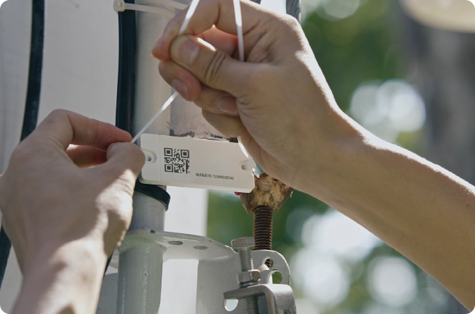This system deploys MakeID smart-tag technology, where each infrastructure component receives a unique QR-coded identifier (as shown by hands attaching tags to tower equipment). It digitally integrates procurement, construction, maintenance, and financial processes through real-time synchronization between physical asset tracking and blockchain-verified data streams, operational efficiency gains while enabling full lifecycle governance of telecom resources.
